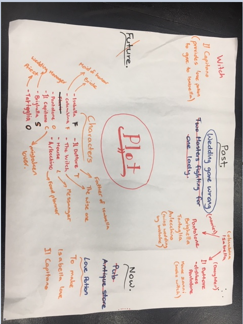Today in class we began to brainstorm process for our History of Theatre Assessment Task. We first began to think about what and how we are able to incorporate as many characters as possible. We considered having a classic wedding gone wrong because at a wedding we can add many characters and Zanni as possible. The basic plot that we came up with was that Isabella is getting married to Flavio but Pantalone wants Isabella to marry someone else so he goes to Brighella to buy a love potion. Meanwhile at the party, a witch curses the wedding to be ruined and the Zanni begin to become rowdy and make many mistakes. Pantalone loses the potion and Arlecchino drinks it by accident. This causes Arlecchino to fall in love with another character. That is as much as we got to in class. Our piece will take place in the slightly dated 1900s because we thought that this was an era where we can toy and play around with different ideas . Our setting will be mostly at a wedding chapel but some of it will be set in the witches’ woods. We have continued to advance through the second lesson and have completed our brainstorm sheet. The characters we thought to include were: Isabella, Pantalone, Il Dottore, Il Capitano, Columbina, Tatahglia, Arlecchino, The Witch and other Zanni like mouse and bird.